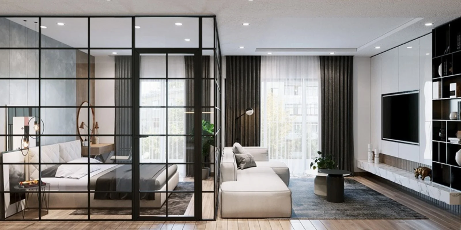 Vật liệu bằng kính được ứng dụng để tạo ra không gian mở rộng rãi và thoáng đãng hơn cho căn hộ